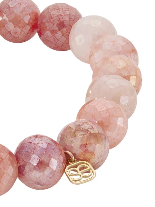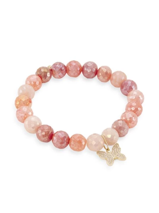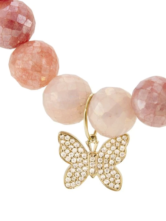 Threaded with faceted peach moonstone beads, Sydney Evan’s stretch bracelet features a diamond-encrusted 14K-yellow-gold butterfly charm. Brand founder Rosanne Karmes draws inspiration from travel, culture, and the arts to craft her whimsical jewelry that often pairs precious metals with vibrant gemstones.