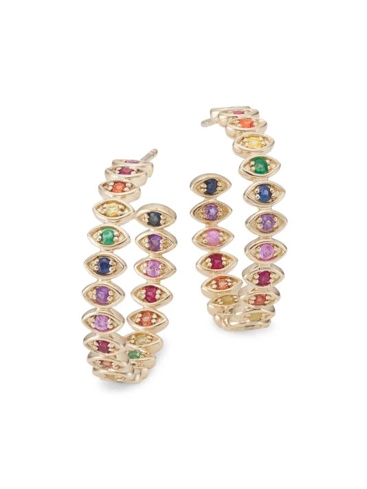 Marquis-shaped gold evil eyes are crafted into a hoop shape, centered with rainbow stones.