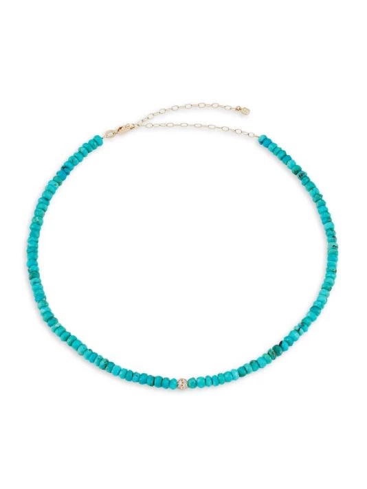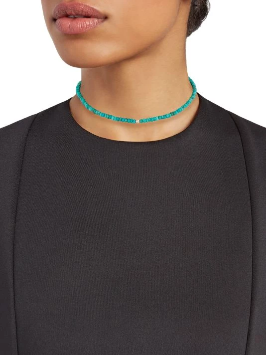 Securing with a 14K yellow gold clasp, this vibrant choker showcases a strand of turquoise beads punctuated by a single white-diamond-encrusted 14K yellow gold bead.