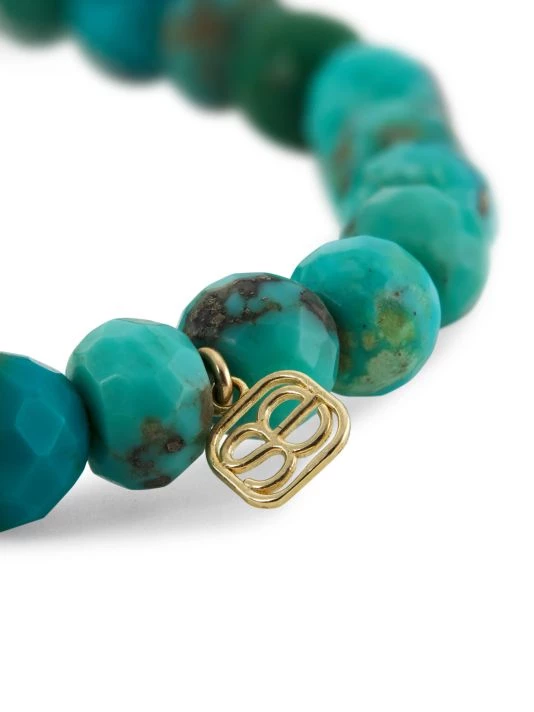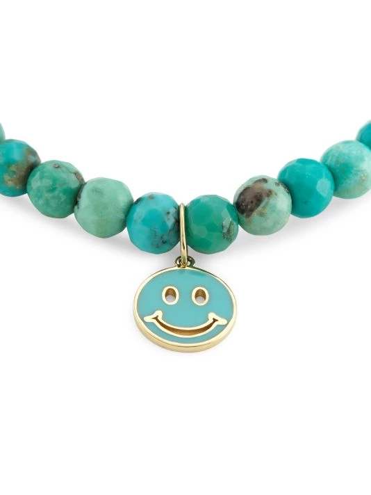 Threaded with vibrant turquoise beads, this Sydney Evan stretch bracelet features an enameled 14K-yellow-gold happy-face charm detailed with cutouts. Founded by Rosanne Karmes in Los Angeles in 2001, the jewelry brand is celebrated for its whimsical designs often inspired by spirituality, culture, and travel.