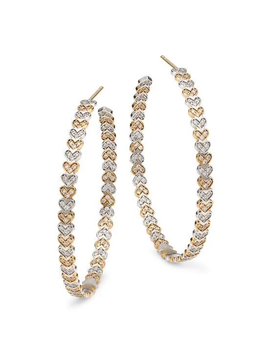 Tiny hearts in alternating 14K yellow and white gold form these large hoop earrings, while 270 brilliant diamonds add sparkle and shine.