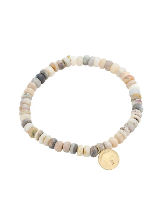 Multicolor Australian opal rondelle beaded bracelet set with a diamond-studded medallion showcasing three luck and protection symbols.