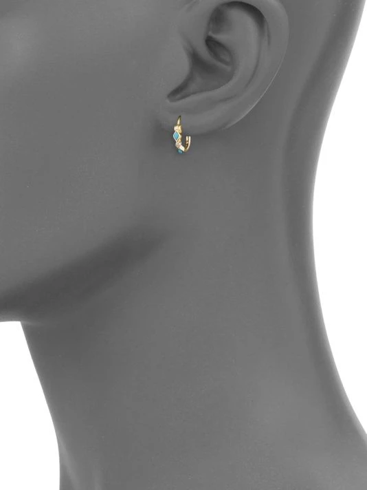 Rich turquoise and glittering diamonds are set in these 14K yellow gold huggie hoops.