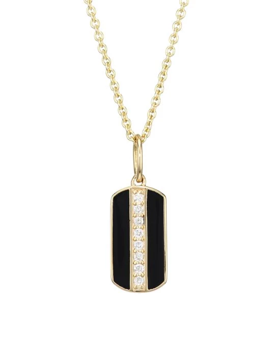 A golden cable link chain trails a diamond pavé striped black enamel dog tag.