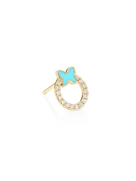 Dazzling diamond pavé circle single stud earring adorned with a luminous turquoise butterfly.