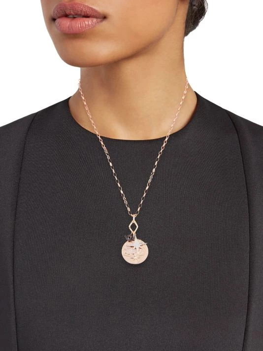 Crafted of 14K rose, yellow and white gold, this whimsical necklace features a cloud nine pendant, starburst charm and eye charm that sparkle with white and black diamonds.