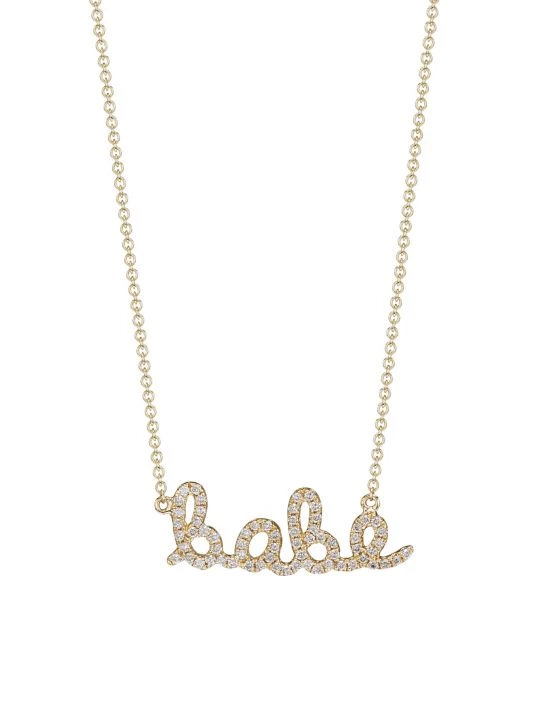 This pendant necklace features a diamond-embellished detail with a word on it.