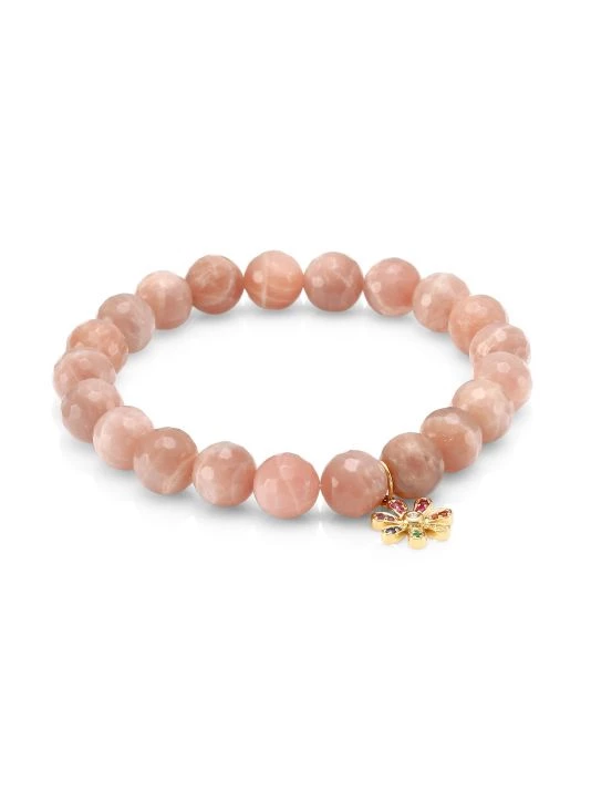 Stunning diamond and gemstones adorn 14K gold daisy charm on moonstone bracelet.