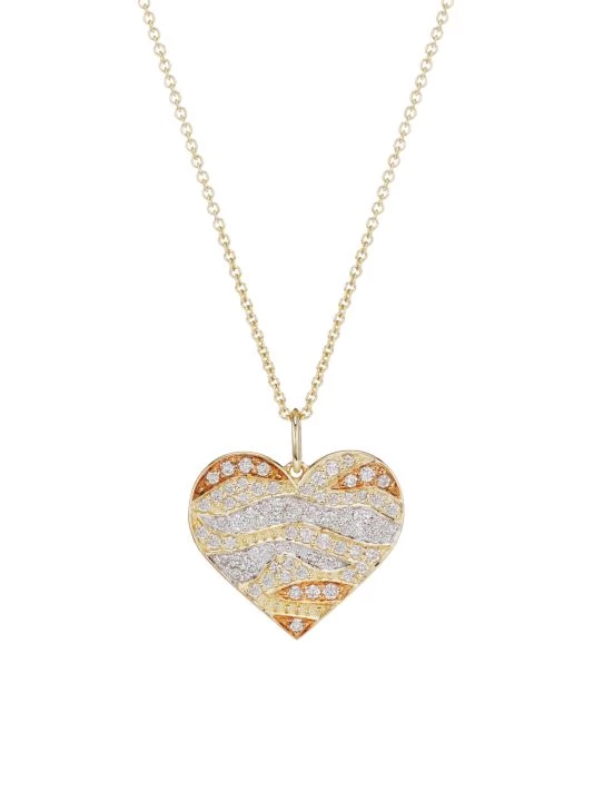 This heart pendant necklace features multiple tones of gold and diamonds.