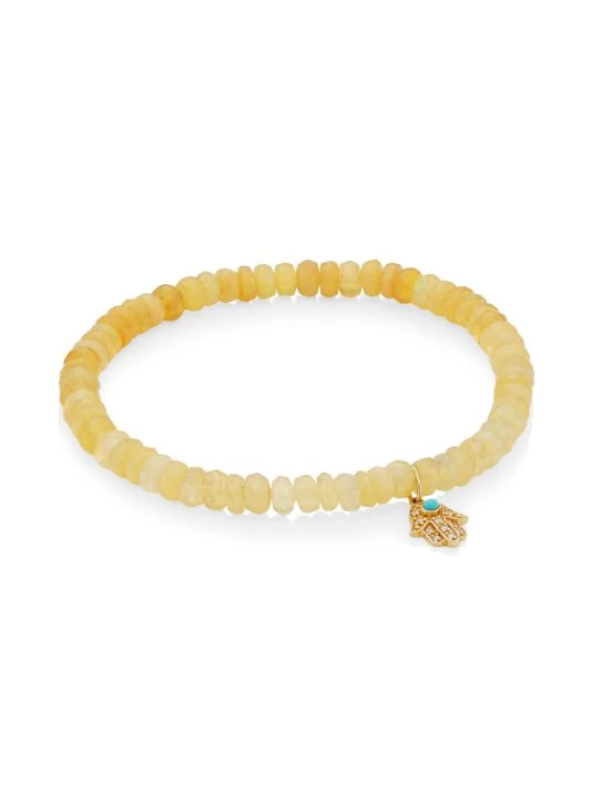 Beaded opal bracelet with diamond-studded Hamsa charm.